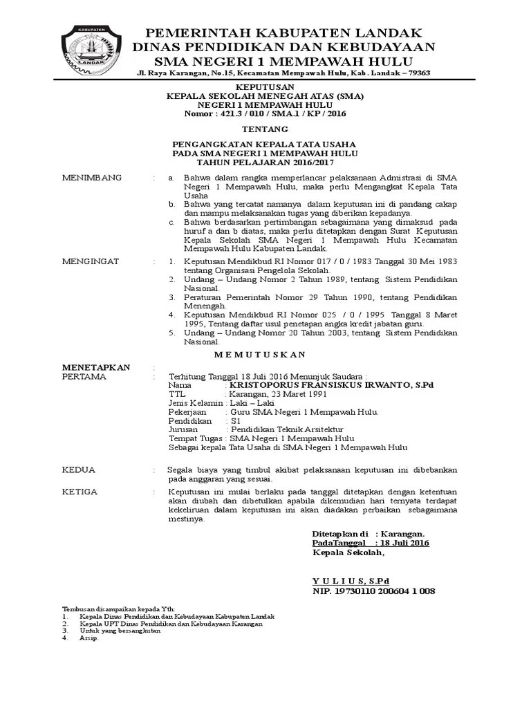 Pada sma negeri 1 trienggadeng tahun 2007 / 2008. Contoh sk pengangkatan tenaga administrasi. Membuat surat instruksi kepala sekolah. Pembagian tugas pegawai tata usaha dan penjaga sekolah. Kepala sekolah sma negeri 1 mempawah hulu kecamatan.